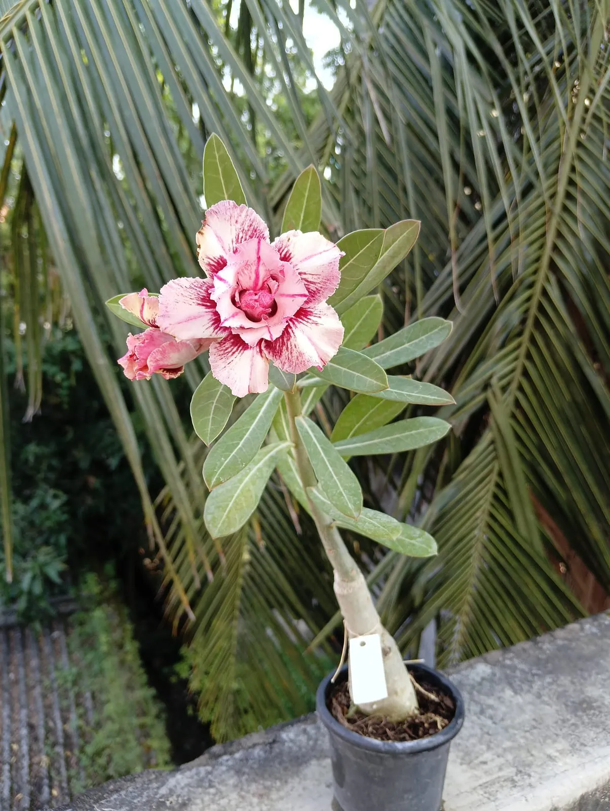 This striking Desert Rose variety features soft creamy white petals beautifully accented with vivid crimson brush strokes, giving each bloom an artistic, hand-painted look. The multi-layered petals create depth and elegance, making it an irresistible highlight in any indoor or outdoor plant collection.