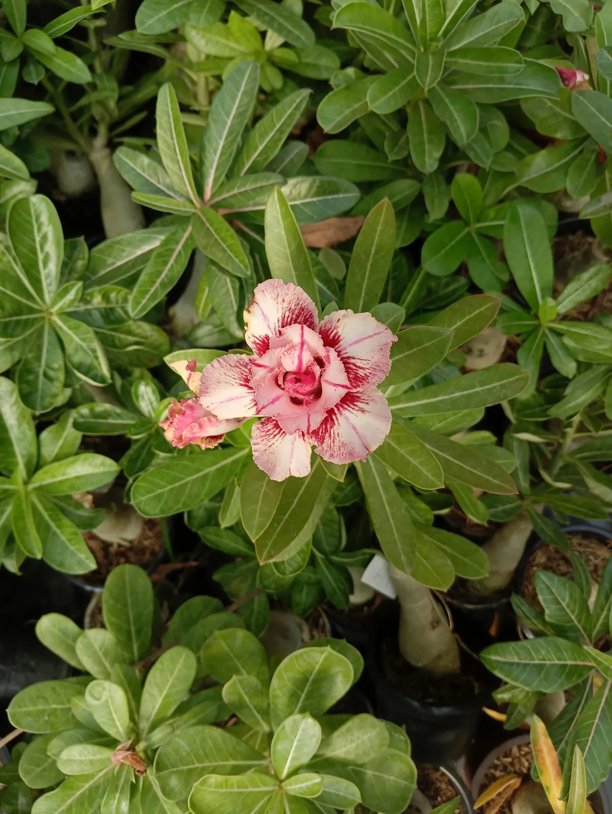 Charming Multi Petal Adenium with Creamy White Petals & Crimson Brush Strokes!