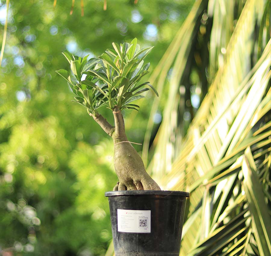 This beautifully sculpted multi-grafted Adenium is a true collector’s piece. Grafted with multiple flower colors, including deep maroon and creamy yellow blends, this Desert Rose brings a burst of vibrant charm to any garden or balcony. Its thick, bulbous caudex and healthy green foliage showcase excellent overall plant health and strong growth.