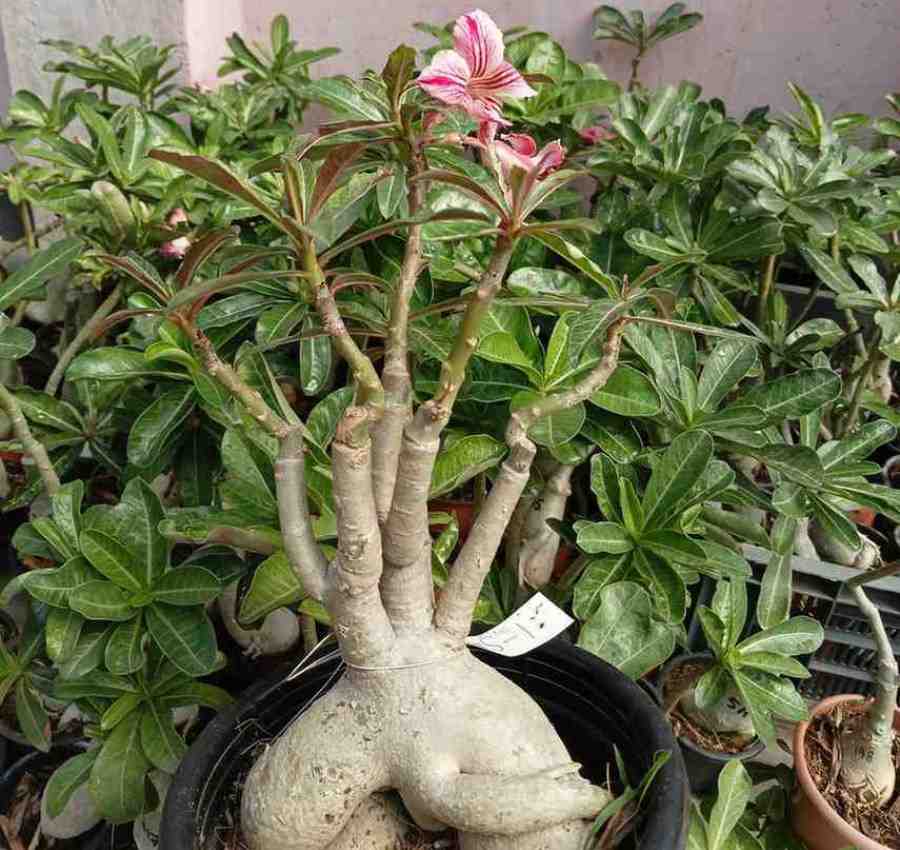 Carefully nurtured for optimal growth and abundant flowering, this adenium is a collector’s delight for its rare and vibrant color pattern. Each bloom showcases unique red and white striping, delivering a luxurious and exotic appeal that is both rare and highly desirable. Whether you are an avid plant collector or looking to add a splash of color to your home décor, this adenium is an ideal choice.