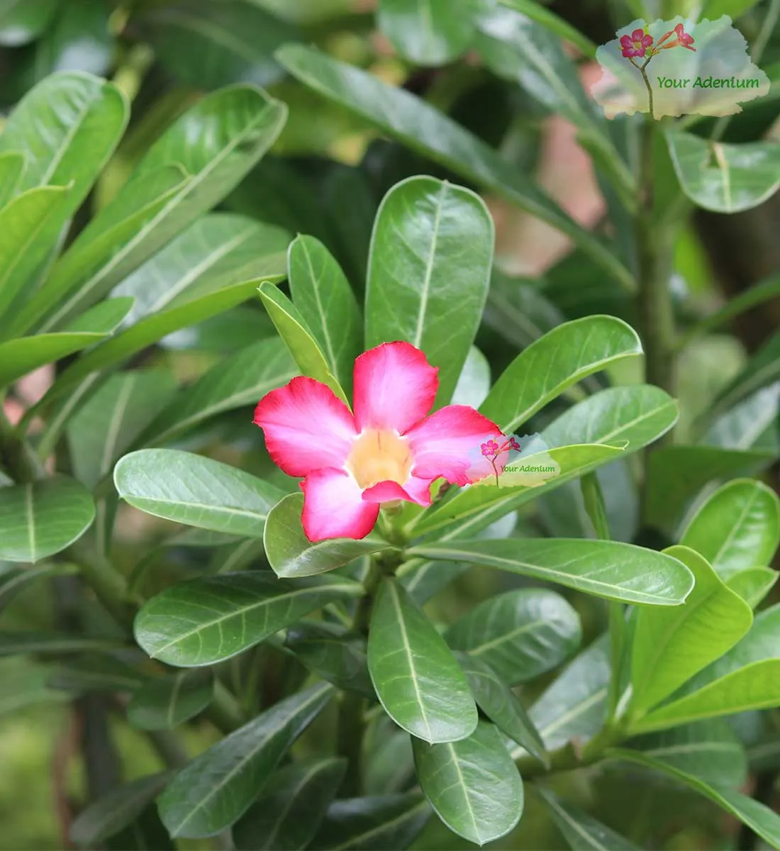 The Adenium obesum, commonly known as the desert rose, is a stunning flowering plant admired for its vibrant, heavy-blooming pink flowers and lush green leaves. The single-petal pink adenium is popular for plant lovers and bonsai enthusiasts due to its unique beauty, resilience, and ability to thrive with minimal care.