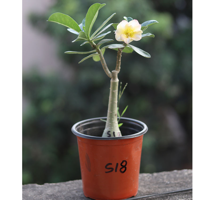 The Single Petal Soft Cream with Yellow center Adenium, also known as the Yellow Desert Rose, is a stunning ornamental plant that adds elegance and warmth to any space. This particular variety showcases soft yellow, single-layered blooms that evoke a sense of calm and simplicity, making it a favorite among collectors and gardeners alike. Its trumpet-shaped flowers contrast beautifully with its thick, succulent stem and glossy green leaves, creating a visually appealing and balanced aesthetic.