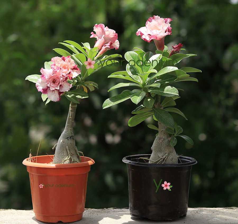 2 is a premium imported Vietnamese Vietnamese Adenium variety, best known for its large, ruffled pink flowers with soft white edges. A true visual treat, this flowering plant produces multi-layered rose-like blooms that create a striking contrast against its dark green leaves and swollen bonsai-style caudex.