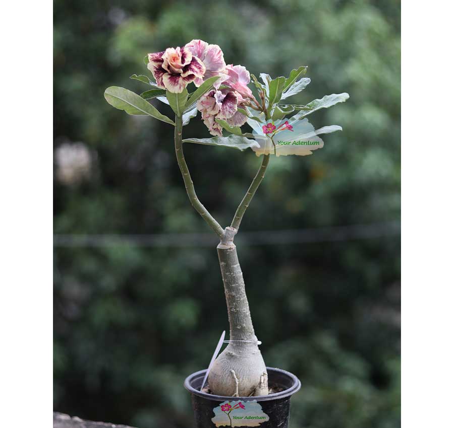 Double Petal Adenium flowers Plant are trumpet-shaped, with vibrant colors of yellow and red. These blooms often grow in bunches, creating a captivating display. The flower petals are double, making them even more striking. This plant’s flowers bring warmth and life to any garden, especially in India’s tropical climate.